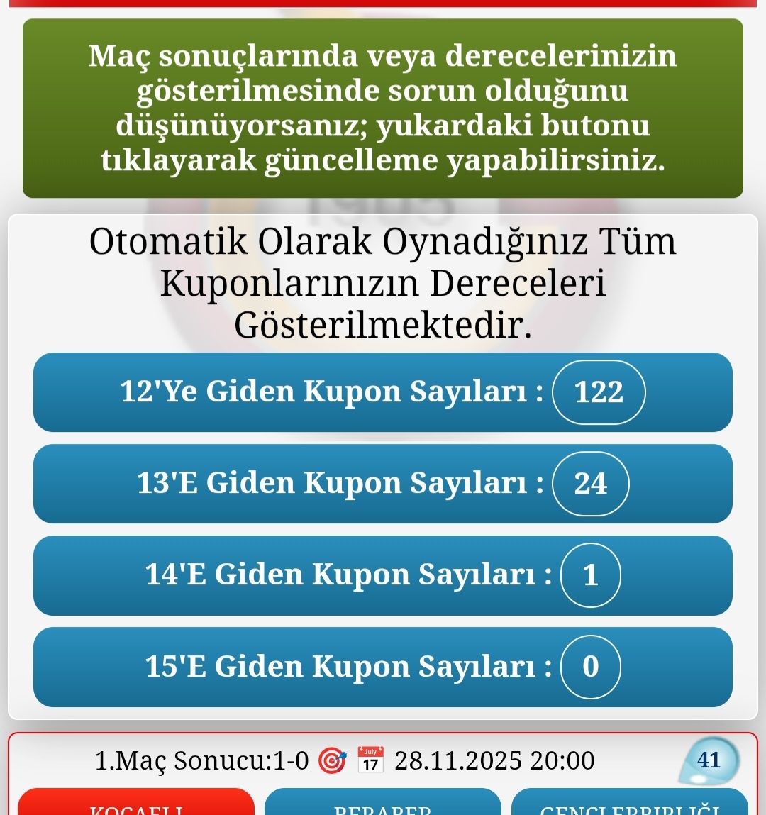 Sitemizde ve yasal bahis sitelerinde özellikle spor totonun son günü aşırı yoğunluk olduğundan kuponlarınızı otomatik oynamak için Lütfen Son Güne Bırakmayınız.